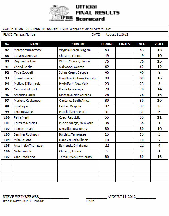 Nola Trimble joined Sarah Hurrle as the only competitors with multiple IFBB wins in the newly-formed Women’s Physique division. Trimble, who won the Chicago Pro in July, has now won the last two IFBB Women’s Physique contests.