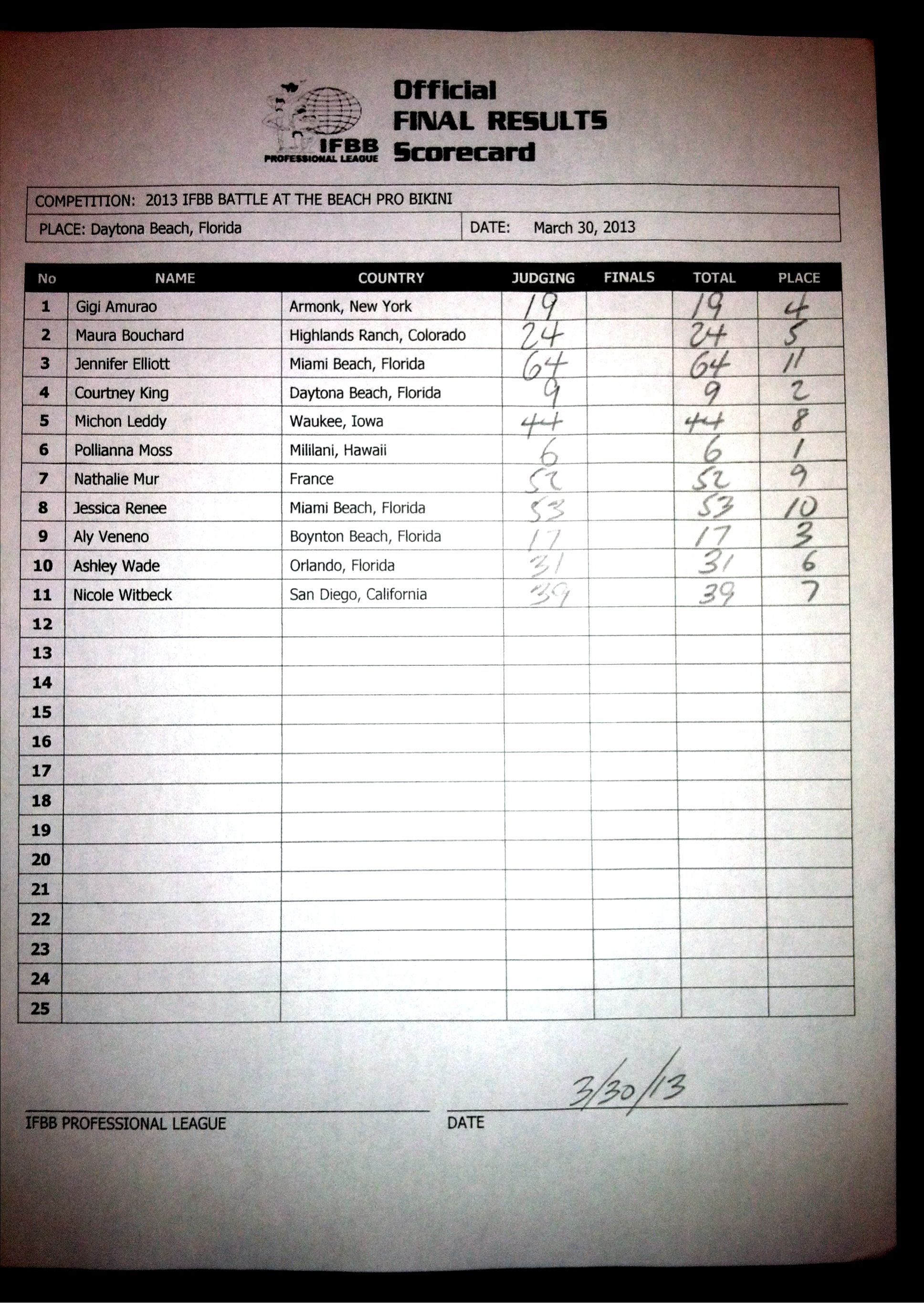 Courtney King and Aly Veneno placed second and third, respectively. King, who earned her pro card at last year’s NPC USA Championships, is 19 years old. Veneno earned her pro card at last year’s NPC Nationals. She placed fifth in her pro debut at the Pro World Bikini Championships in December.