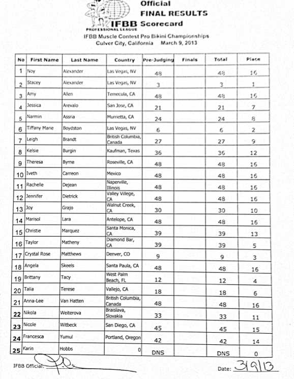 Displaying her best overall look to date and brimming with confidence, Alexander earned straight firsts on the judges’ scorecards to earn the second win of her two-year IFBB career. Alexander, who earned her pro card at the 2011 NPC Nationals, notched career win No. 1 at last year’s Desert Muscle Classic. Alexander placed fourth at the 2012 MuscleContest Championships.