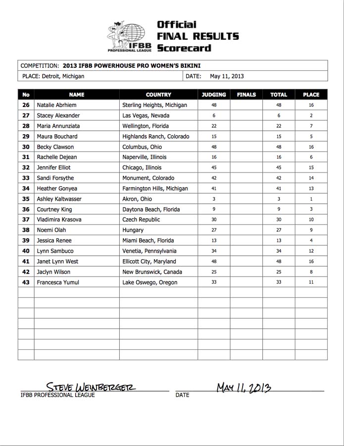 Kaltwasser finally earned the first win of her career after a couple of close calls over the past three weeks. Kaltwasser, who earned her pro card by winning the Overall at last year’s NPC Team Universe, was coming off runner-up finishes at both the Europa Show of Champions (April 20) and the Pittsburgh Pro (last weekend). The win automatically qualifies Kaltwasser for her first Bikini Olympia. Stacey Alexander (2nd) and Courtney King (3rd) rounded out the top three.