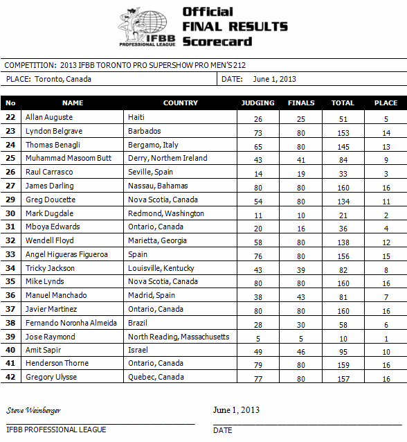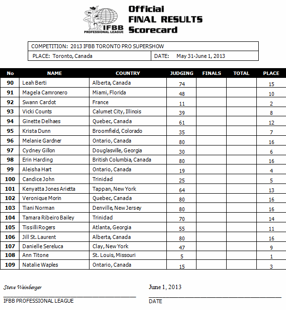 In Figure, Ann Titone won her first contest of the year and third of her career. Titone, who placed third at the 2011 Toronto Pro, won two contests in 2012. Swann Cardot picked up her second-straight runner-up finish. Cardot finished second at last week’s New York Pro. Canada’s Natalie Waples finished third and has placed in the top three of her last three contests.