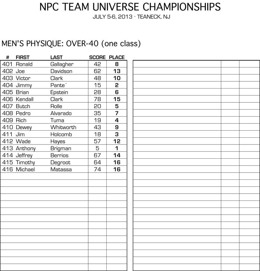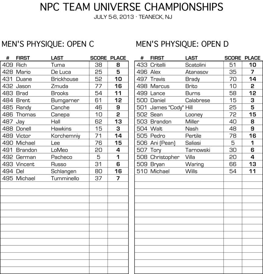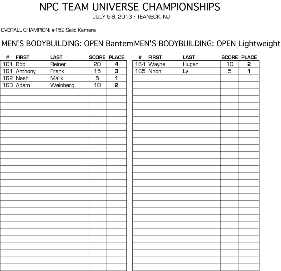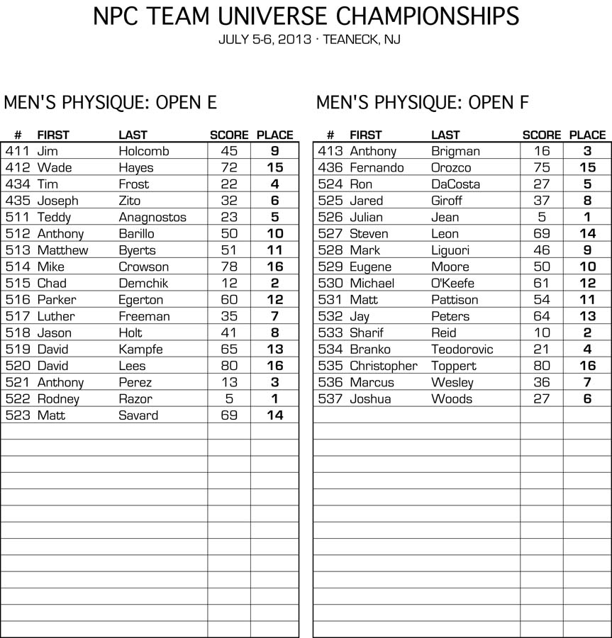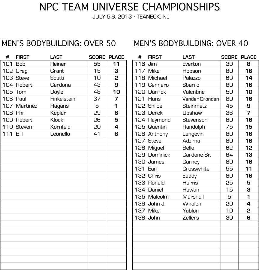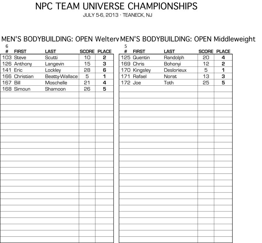 ArticlesContestsFeatures 2013 NPC Team Universe: Official Men’s Score Sheets July 6, 2013 Share on Facebook Tweet on Twitter Official score sheets from the 2013 NPC TEam Universe, complete with total points for each competitor. Note: These score sheets are not to be reproduced without the consent of the National Physique Committee. MEN’S BODYBUILDING MASTERS MEN’S BODYBUILDING MEN’S PHYSIQUE MASTERS MEN’S PHYSIQUE