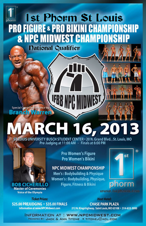 Held in conjunction with the IFBB St. Louis Pro Figure and Bikini Championships. Branch Warren highlights the event as the featured guest poser, his first guest posing appearance of 2013.